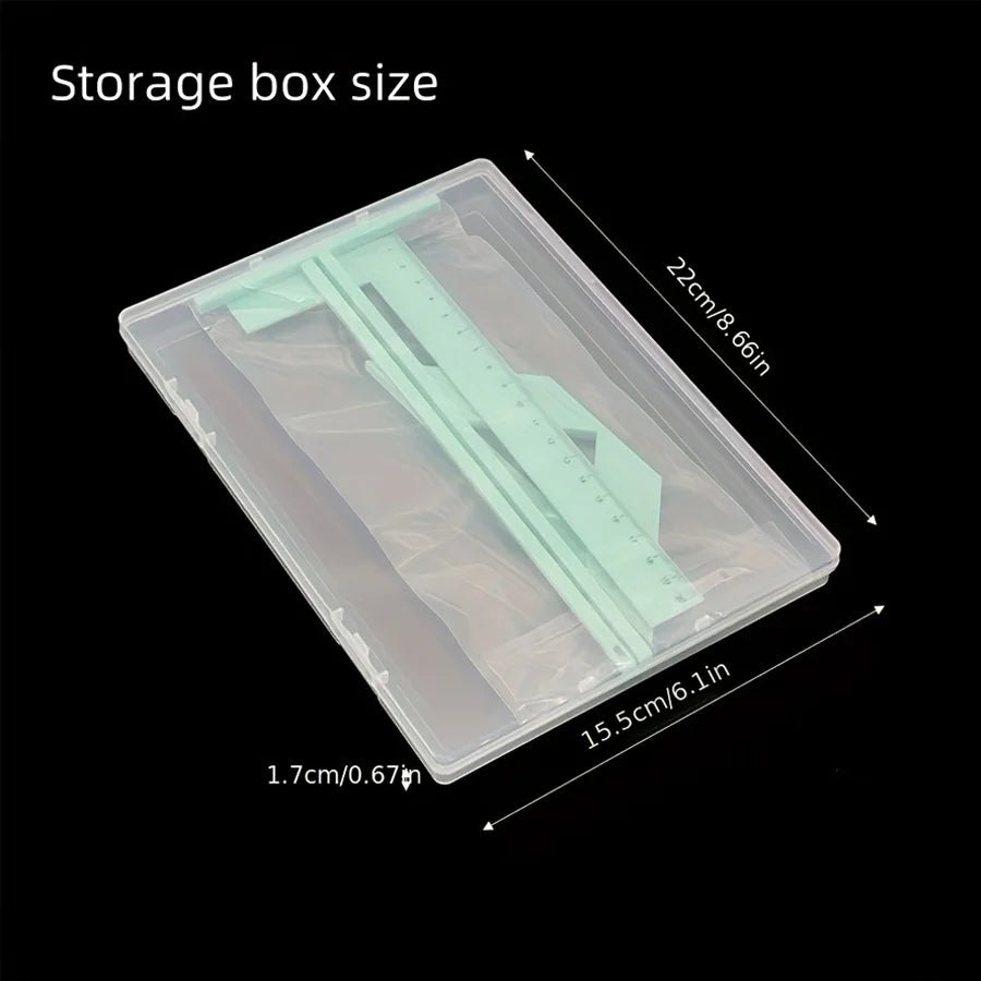 3. Each set includes L-shaped rulers, T-shaped rulers, spacing guide rails, beveled square towels and a carrying case. The L-shaped ruler is used to place the covers and maintain the necessary margins for fixing them. Align the cover and spine with a T-shaped ruler and mark the appropriate distance to facilitate folding and photo albums. The separation rails with two positions, 2mm and 1.5mm, mark the distance between the covers so that they can be folded. Square corner tool, used for cutting corners in front of the lining to mark excess paper.It is suitable for scrapbooks, binding projects, making scrapbooks, photo albums, and notebook covers.