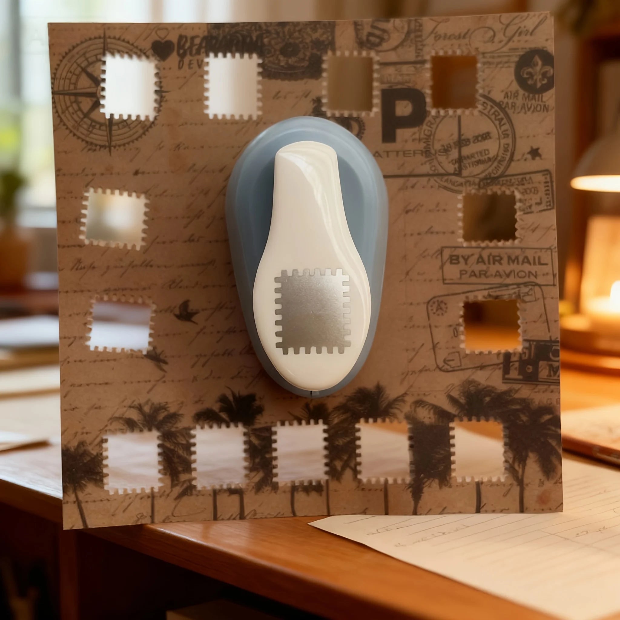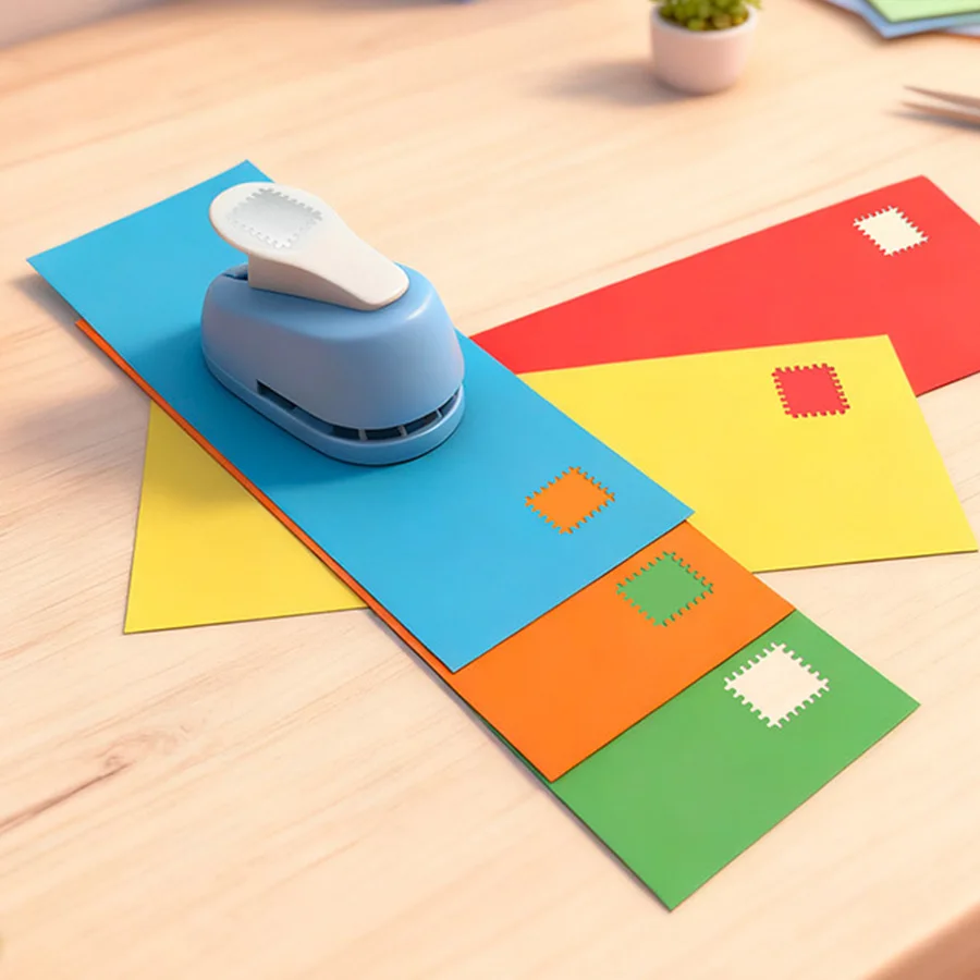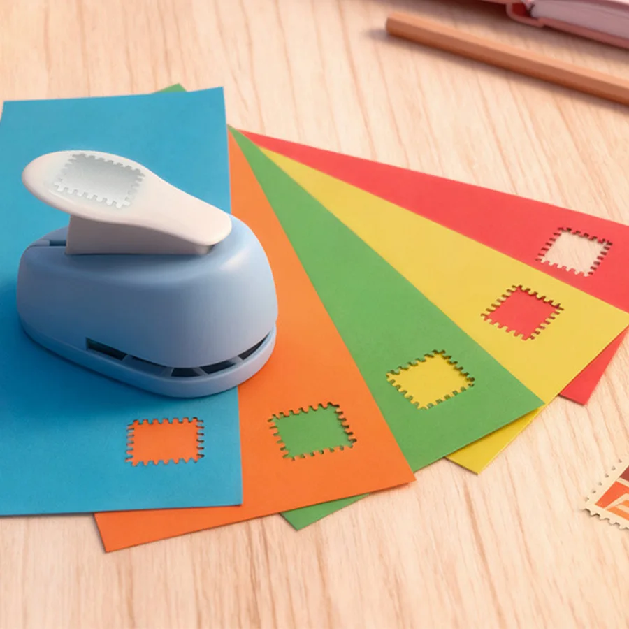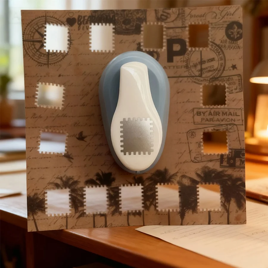 Stamp shaped decorative paper punch press and embossing tools, scrapbook card making and photo processing techniques